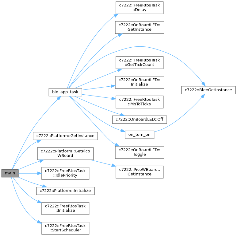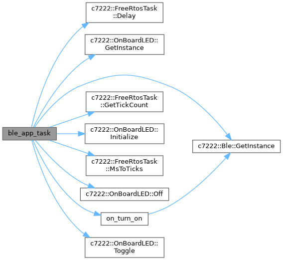 GapEventHandler from examples/ble/common/gap_event_handler.hpp is used to log GAP events (advertising, scanning, connections). It provides a lightweight, reusable handler for examples.c7222::Ble and c7222::Gap encapsulate BTstack and provide the APIs for advertising and data updates.c7222::OnBoardLED provides a visible heartbeat while advertising.c7222::FreeRtosTask wrapper is used for task lifecycle and delay/tick helpers. | void ble_app_task | ( | void * | params | ) |